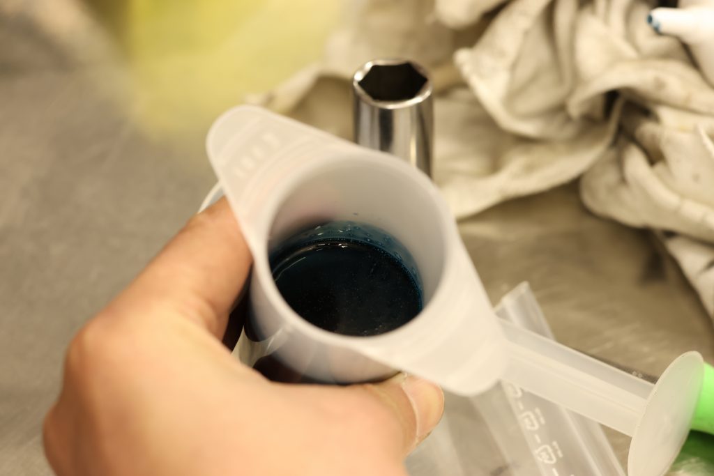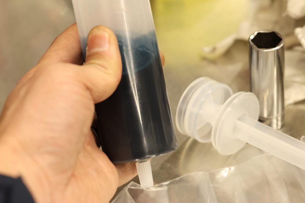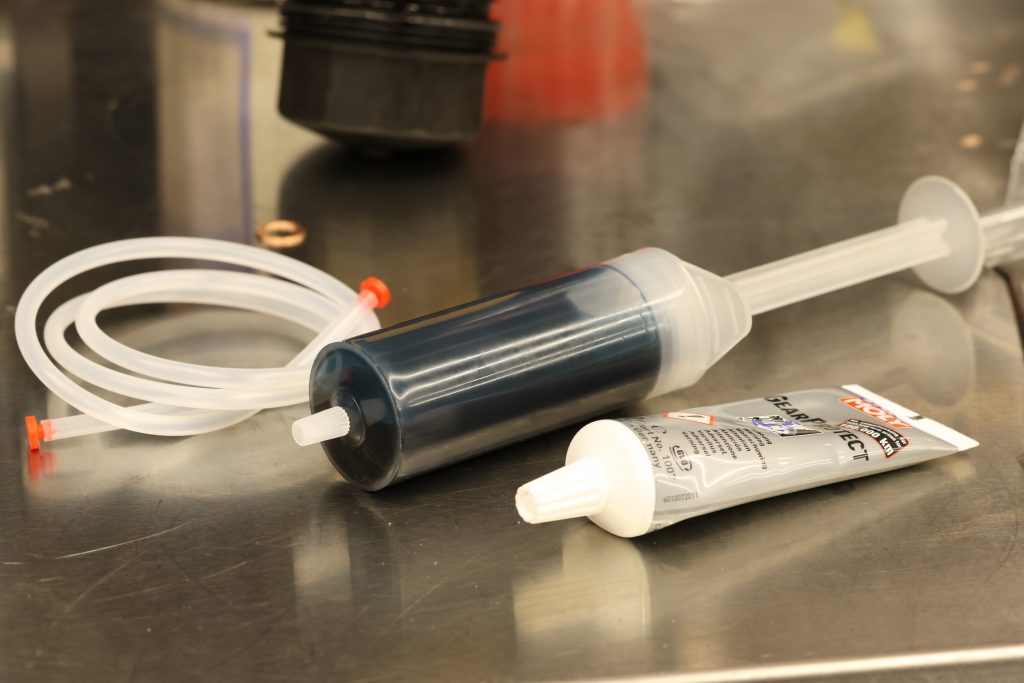 注射器を使って入れるタイプ。オイル2リッターに対して80mlを注入しますが、注射器のホースが長すぎてかなりロスが出そうなので、ホースは極力短めに。
