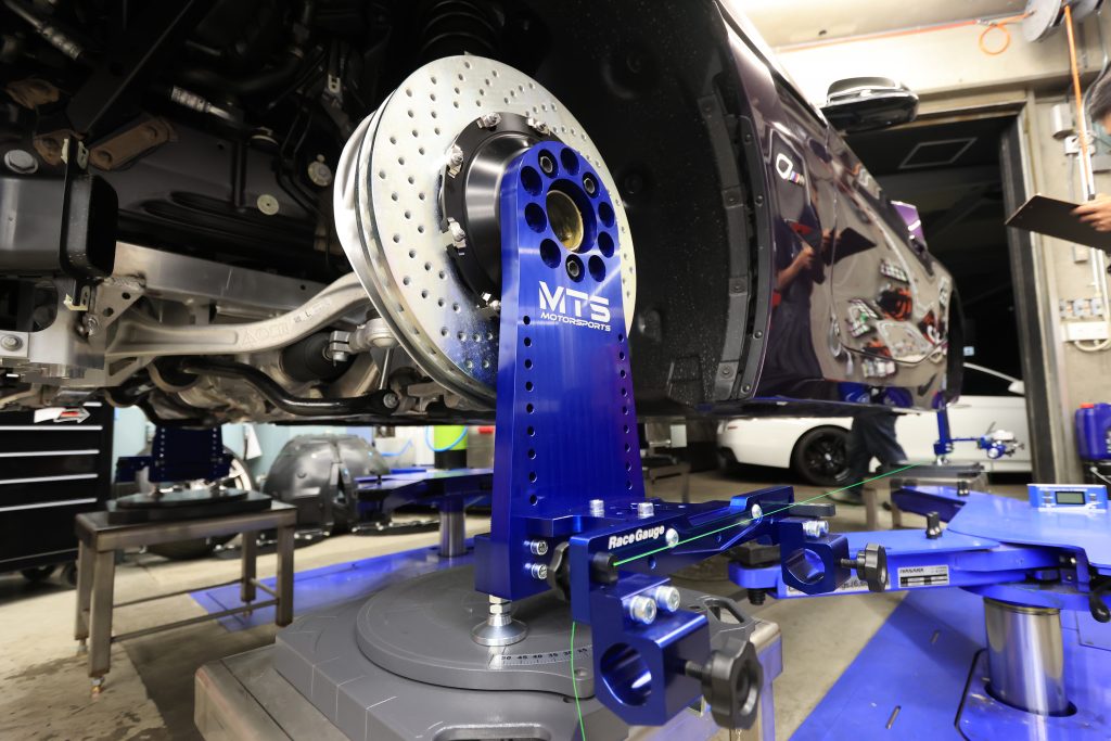 専用の定盤を使って平面だし。ホイールハブに固定する為、全てのアーム類にアクセスが容易に出来る為、精度も出せます。