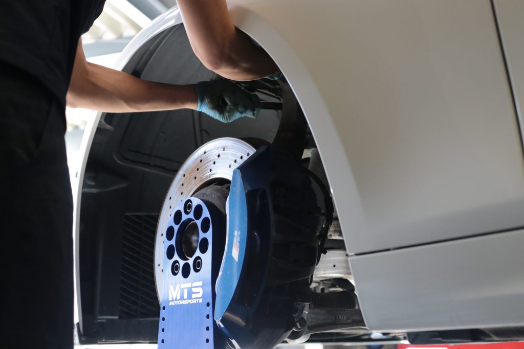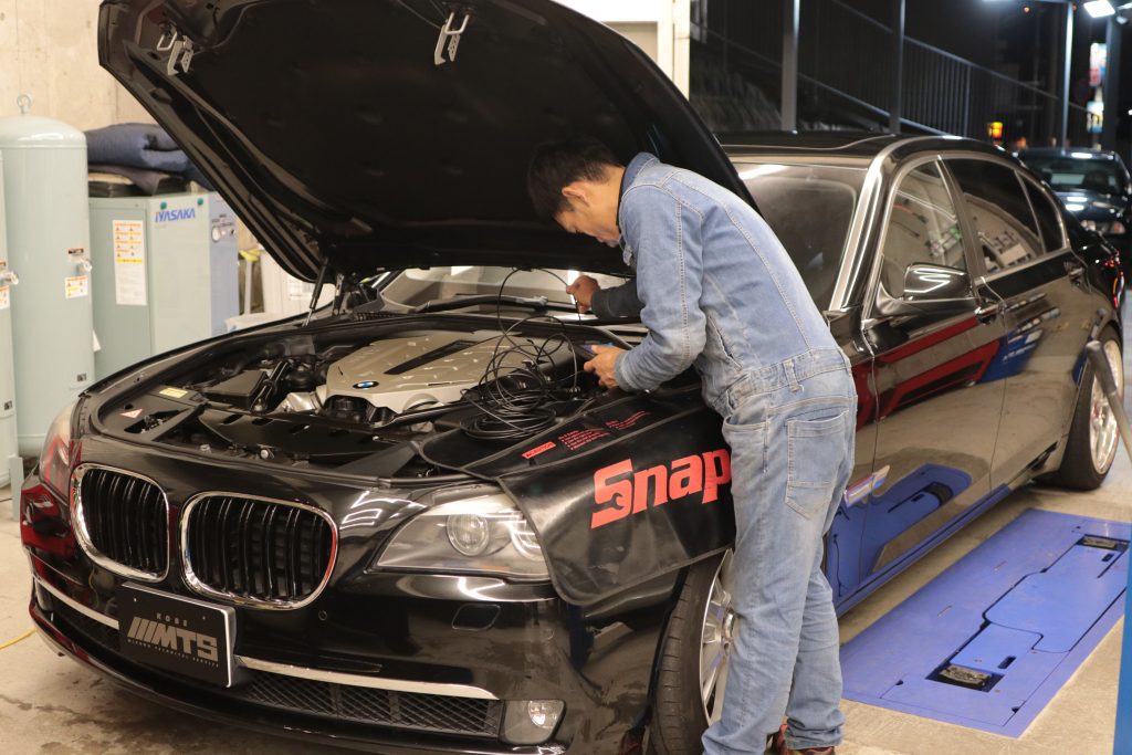 続いてF10 M5はレースゲージを使ったアライメント作業です。