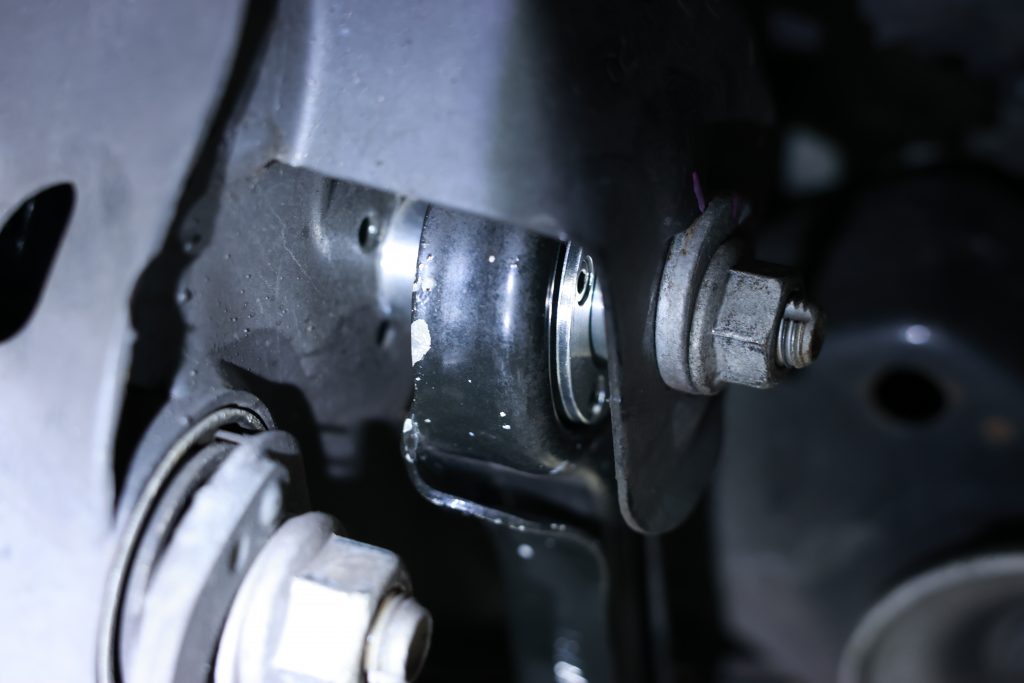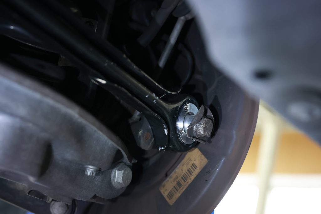 リアのトーコンアーム。このアーム、ゴムのままだと凄くアライメント変化するんです。僕もレースゲージで測定して初めて知りました。このアーム、断面図で見ると“M”なんですが、意識しているんでしょうか。冗談です。