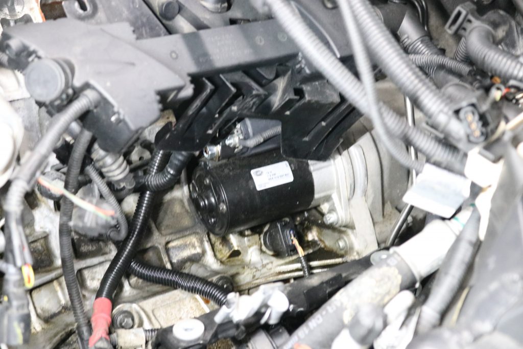インテークマニホールドを外したところ。セルモーターの下付近に溜まっています