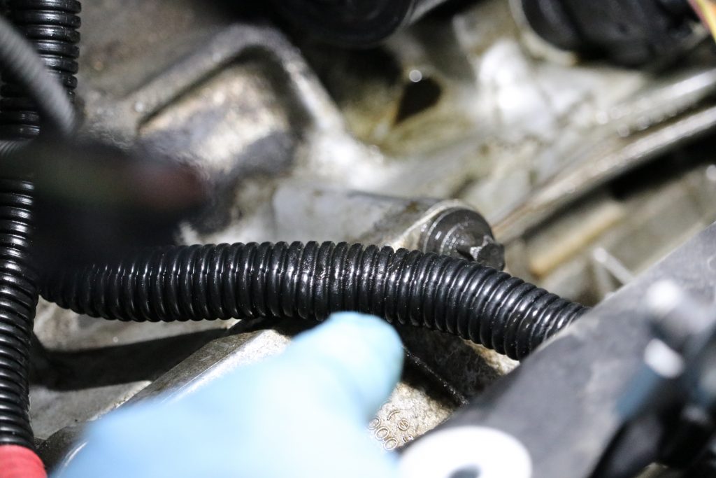 インテークマニホールドの下にブローバイとオイルを分離する機構が付いているのですがそのホースの通っているところが正規の位置ではなく